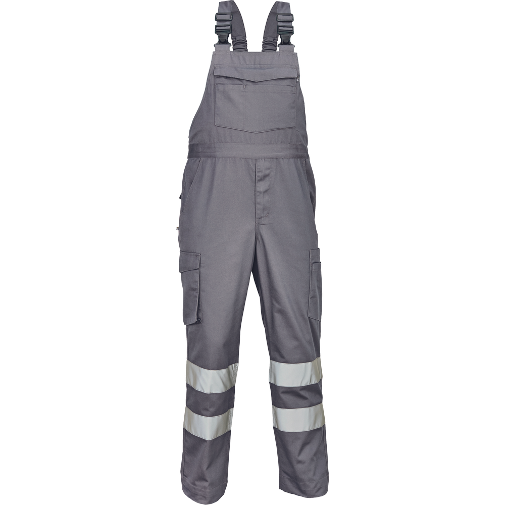 • pánské lehké pracovní kalhoty s laclem a reflexními pruhy na nohavicích, elastický pas • 2 boční kapsy, 1 kapsička na mince • 2 multifunkční stehenní kapsy, 2 zadní kapsy • 1 velká multifunkční náprsní kapsa • elastické šle se zapínáním na sponu • nastavitelná délka nohavic