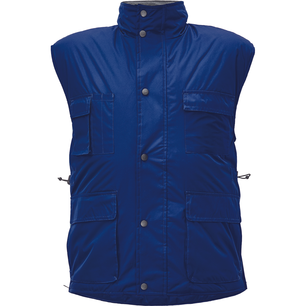 • zateplená nepromokavá pánská zimní vesta • prodloužený díl na zádech • polyesterový materiál s mechanicky odolnou úpravou RipStop • 2 přední kapsy, 2 náprsní kapsy • spodní lem ke stažení na šňůrku • na bocích je polohování na zip pro regulaci obvodu vesty