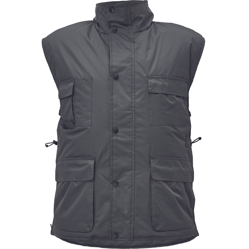 • zateplená nepromokavá pánská zimní vesta • prodloužený díl na zádech • polyesterový materiál s mechanicky odolnou úpravou RipStop • 2 přední kapsy, 2 náprsní kapsy • spodní lem ke stažení na šňůrku • na bocích je polohování na zip pro regulaci obvodu vesty