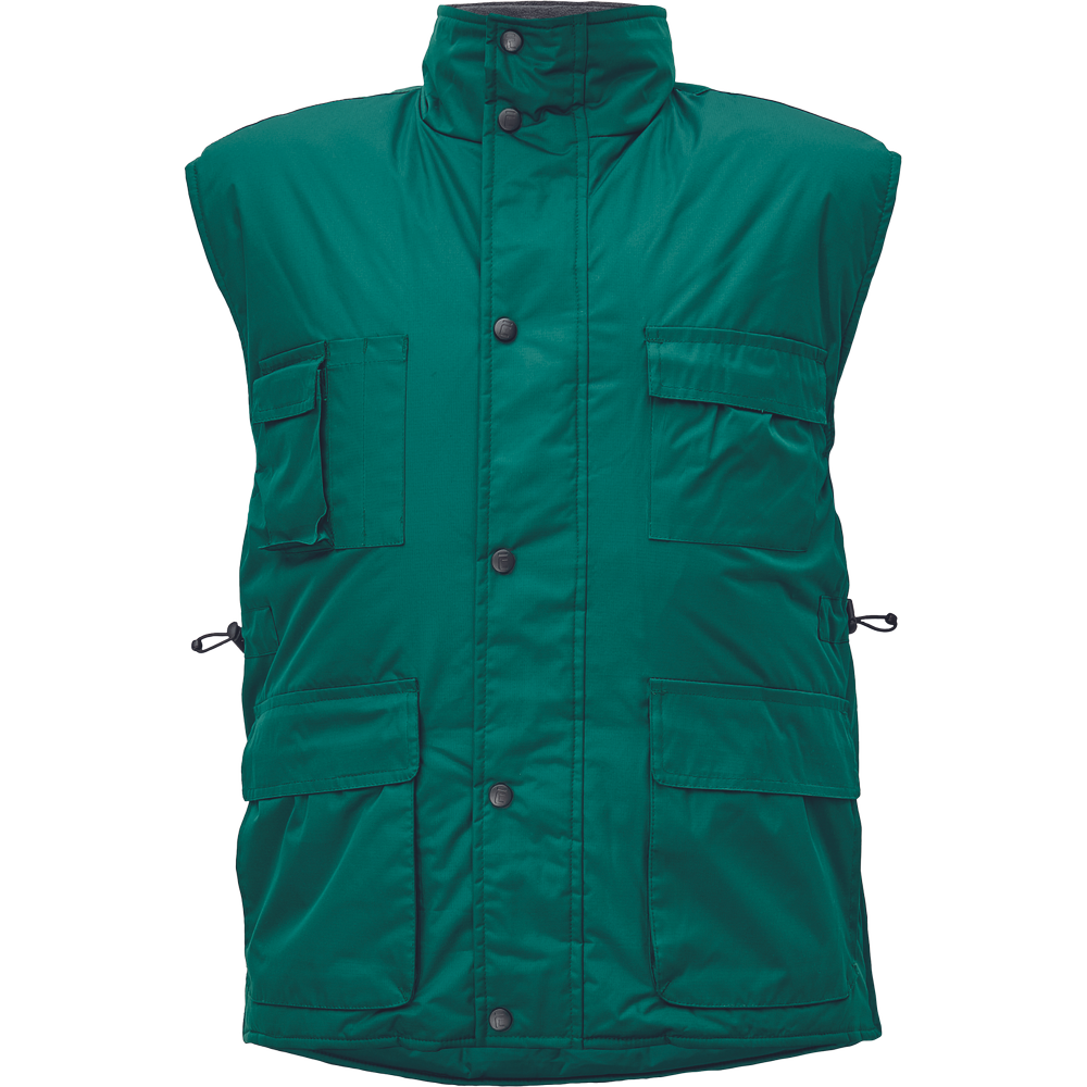 • zateplená nepromokavá pánská zimní vesta • prodloužený díl na zádech • polyesterový materiál s mechanicky odolnou úpravou RipStop • 2 přední kapsy, 2 náprsní kapsy • spodní lem ke stažení na šňůrku • na bocích je polohování na zip pro regulaci obvodu vesty
