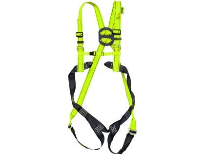 Bezpečnostní celotělový postroj, základní vybavení: - zadní připojovací spona - pro připojení systému zachycení pádu, - přední připojovací smyčky - pro připojení systému zachycení pádu, - zapínací a nastavovací spony - pro komfortní nasazení a používání postroje - nastavitelné stehenní popruhy