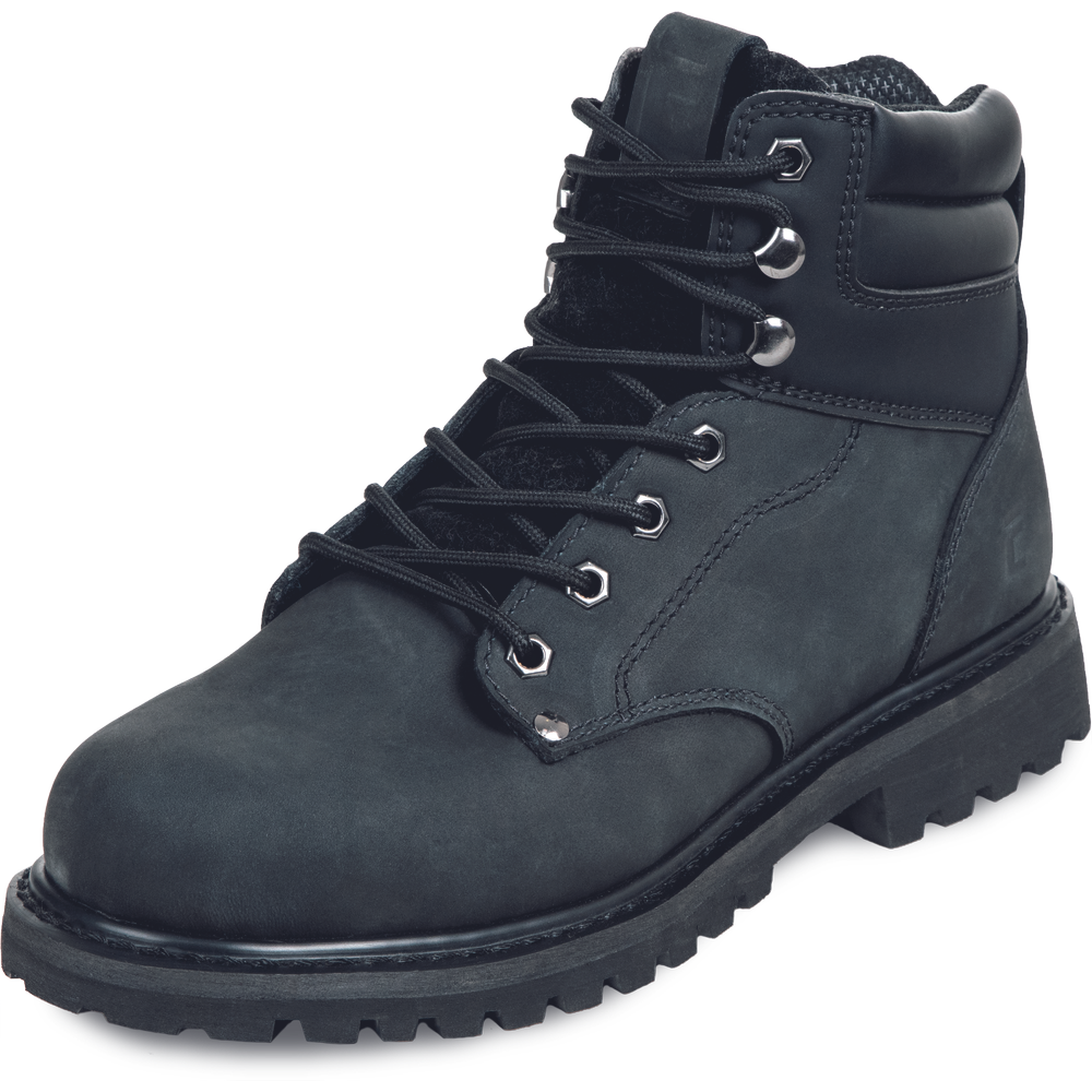 • kotníková pracovní obuv bez ocelové špičky • antistatická protiskluzová gumová podrážka odolná vůči oleji • absorpce energie v patě • vodotěsný prodyšný svršek z nubukové kůže