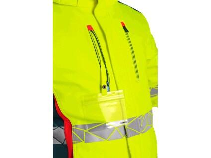 >Pánská výstražná zateplená bunda s odepínací kapucí, odolná proti vodě a větru. Fleecový límec, větrání v podpaží, regulovatelné manžety na rukávech, vnitřní manžety v rukávech, kryté zapínání na zip a druky, náprsní a boční kapsy na zip, v pravé náprsní kapse odnímatelné pouzdro na ID kartu, segmentované reflexní pásky, kontrastní HV červené a petrolejové doplňky, vnitřní náprsní kapsy, stahování v dolním okraji, TPU membrána, odolnost materiálu proti průniku vody 8000 mm mimo oblast švů, paropropustnost 5000 g/m2/24h.