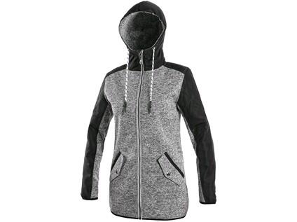 Dámská bunda z pleteniny, prodloužená, kombinace materiálů, kapuce napevno, zapínaní na zip, rukávy zakončeny gumičkou, 2 boční kapsy, reflexní doplňky.