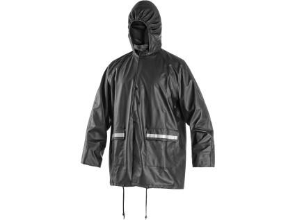 Nepromokavá bunda do deště s kapucí v límci a reflexními doplňky. Zapínání na zip a druky, vnitřní manžety v rukávech do gumy, stahování v dolním okraji, větrání na zádech a v podpaží, lepené švy.