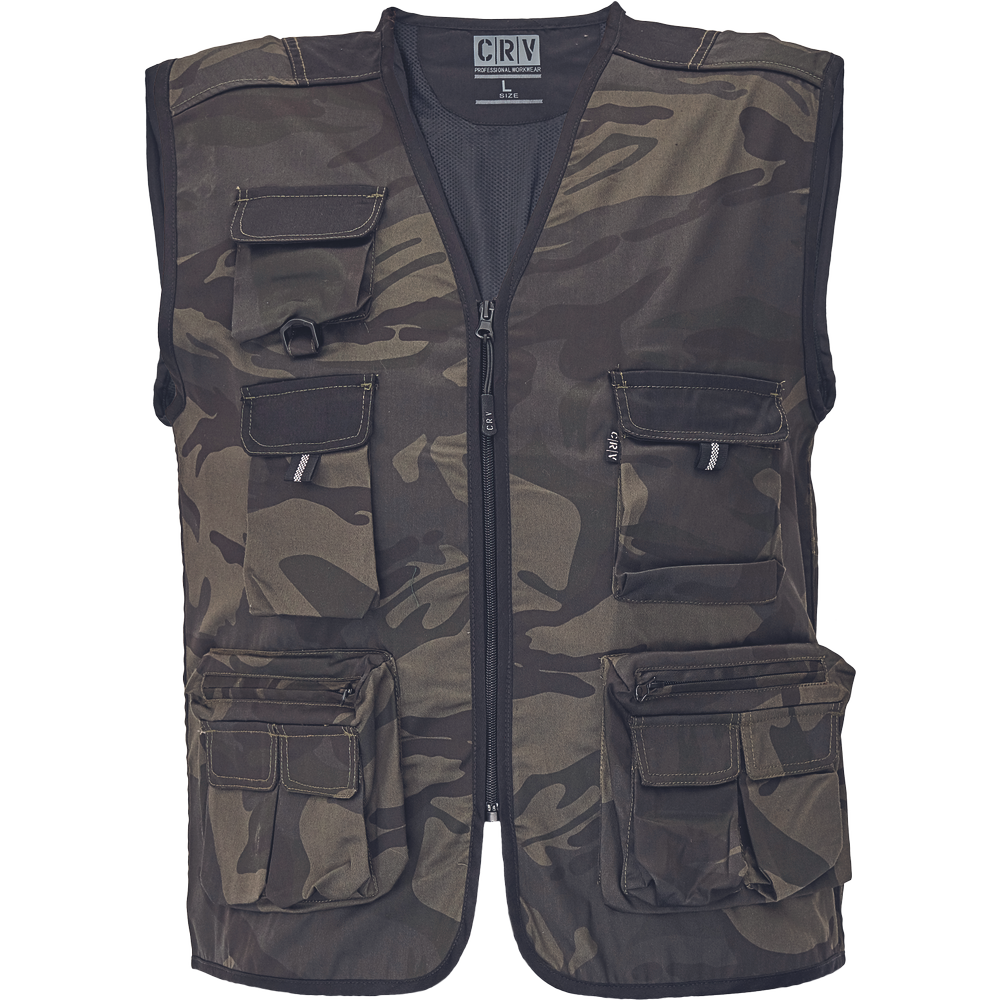 • pánská vesta z lehkého twillu v modních maskáčových barevných kombinacích • zapínání na zip • částečně podšita nylonovou síťovinou • 11 kapes z toho 2 vzadu na boku