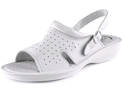 Sandál, dámský, celokožený, perforovaný s páskem kolem paty. Materiál: svršek z přírodní kůže, anatomicky tvarovaná stélka z vepřové kůže, PU podešev.