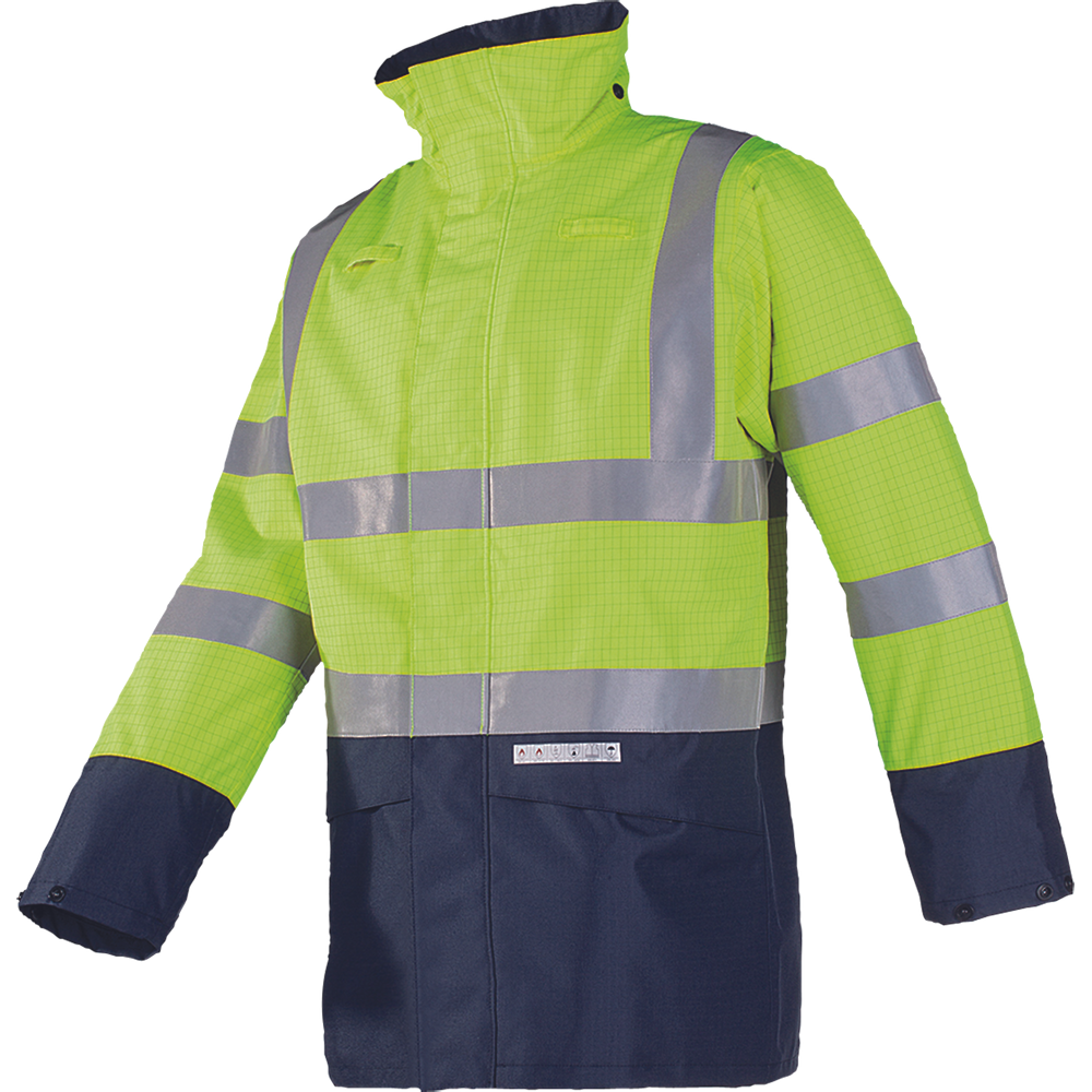• multinormní, nepromokavá, vysoce prodyšná a chemicky odolná HI-VIS bunda • vrchní materiál SIOPOR kombinuje antistatické vlastnosti s odolností vůči teplu a plameni • bavlněná podšívka odolná plameni • 5 cm nehořlavé FR reflexní pruhy • 2 přední kapsy, 1 vnitřní náprsní kapsa