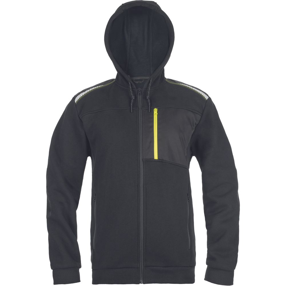 • pánská mikina s kapucí se zapínáním na zip • 2 boční kapsy • 1 náprsní kapsa na zip • zesílená ramena s reflexními pruhy • elastický spodní lem a manžety rukávů