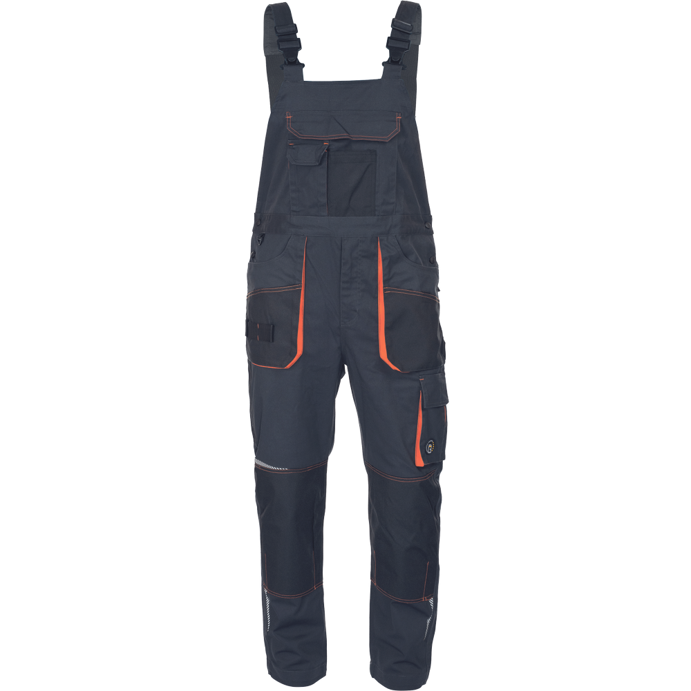• pánské pracovní vysoce odolné strečové kalhoty s laclem • elastický pas • multifunkční kapsy • 1 velká náprsní kapsa • Oxford 600D zesílení kolenních kapes pro vložení chráničů kolen • tištěné reflexní segmentové detaily • nastavitelná délka nohavic