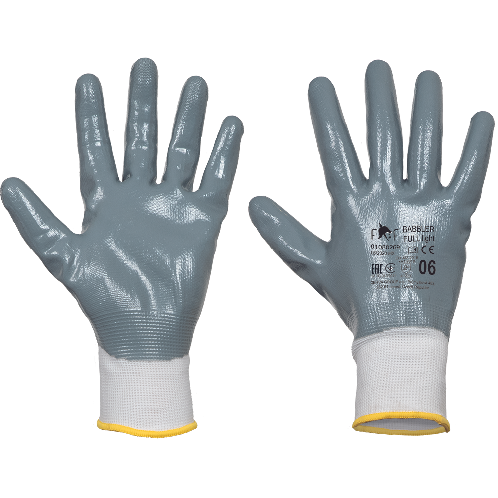 • pletené bezešvé polyesterové rukavice plně máčené v nitrilu