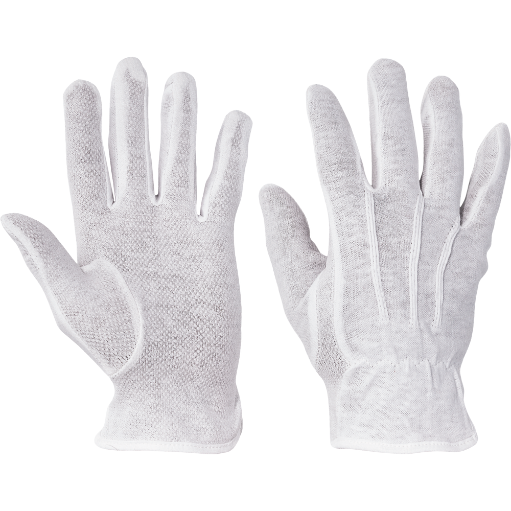 • rukavice šité z bavlněného úpletu • s PVC terčíky v dlani a na prstech • pružinka na horní části zápěstí • bez manžety