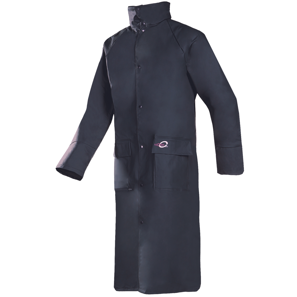 • nepromokavý a větruodolný prodloužený plášť s kapucí v límci • délka 120 cm • zatavené švy • zapínání na druky • 2 přední kapsy kryté légami