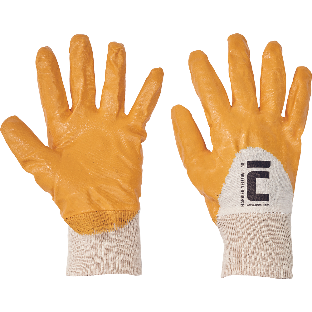• rukavice šité z bavlněného úpletu • polomáčené ve žlutém nitrilu • s pružnou manžetou