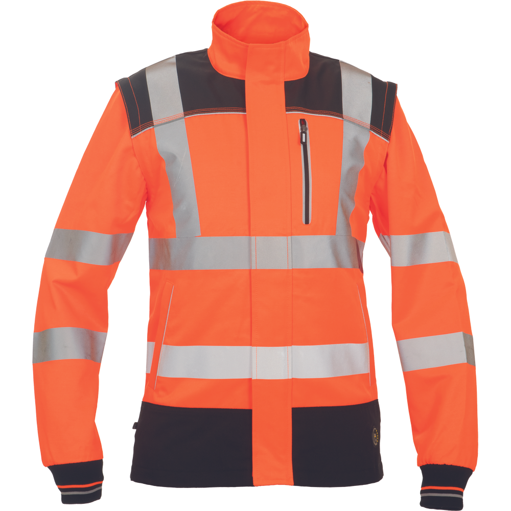 • pánská HI-VIS pracovní bunda s odepínatelnými rukávy • zapínání na zip kryté légou • 600D Oxford zesílení v oblasti ramen • 2 boční kapsy • 1 náprsní kapsa • tištěné 5 cm reflexní pruhy • elastické náplety rukávů