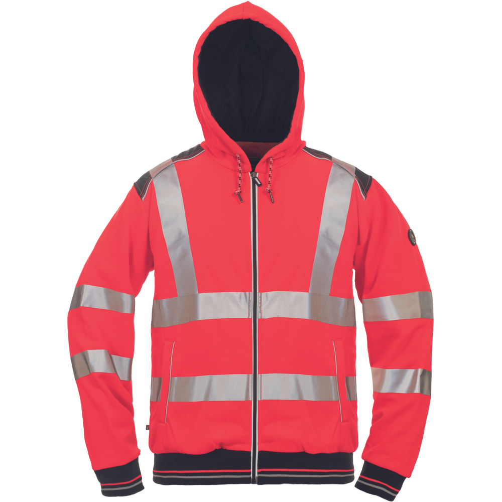 • HI-VIS celopropínací mikina s kapucí ze směsového úpletu polyesteru a bavlny • sedlo v kontrastní černé barvě lemované reflexní paspulkou • dvouvrstvá kapuce se stažením na šňůrku • 600D Oxford zesílená oblast ramen • tištěné 5 cm reflexní pruhy • 2 boční kapsy • elastické náplety na rukávech a v pase