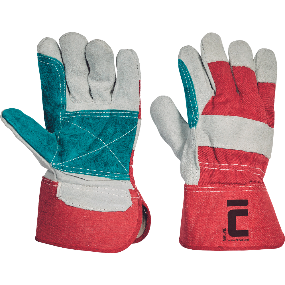 • rukavice z hovězí štípenky s podšívkou a zesílenou vrstvou v dlani • s bílou bavlněnou tkaninou na hřbetu • tuhá manžeta