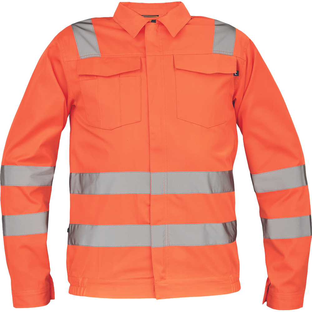 • pánská lehká full HI-VIS pracovní bunda s reflexními pruhy přes ramena, v bocích a na rukávech • zapínání na zip kryté légou na suchý zip • 2 náprsní kapsy s klopou • nastavitelná šířka rukávů pomocí suchého zipu • elastický lem boků