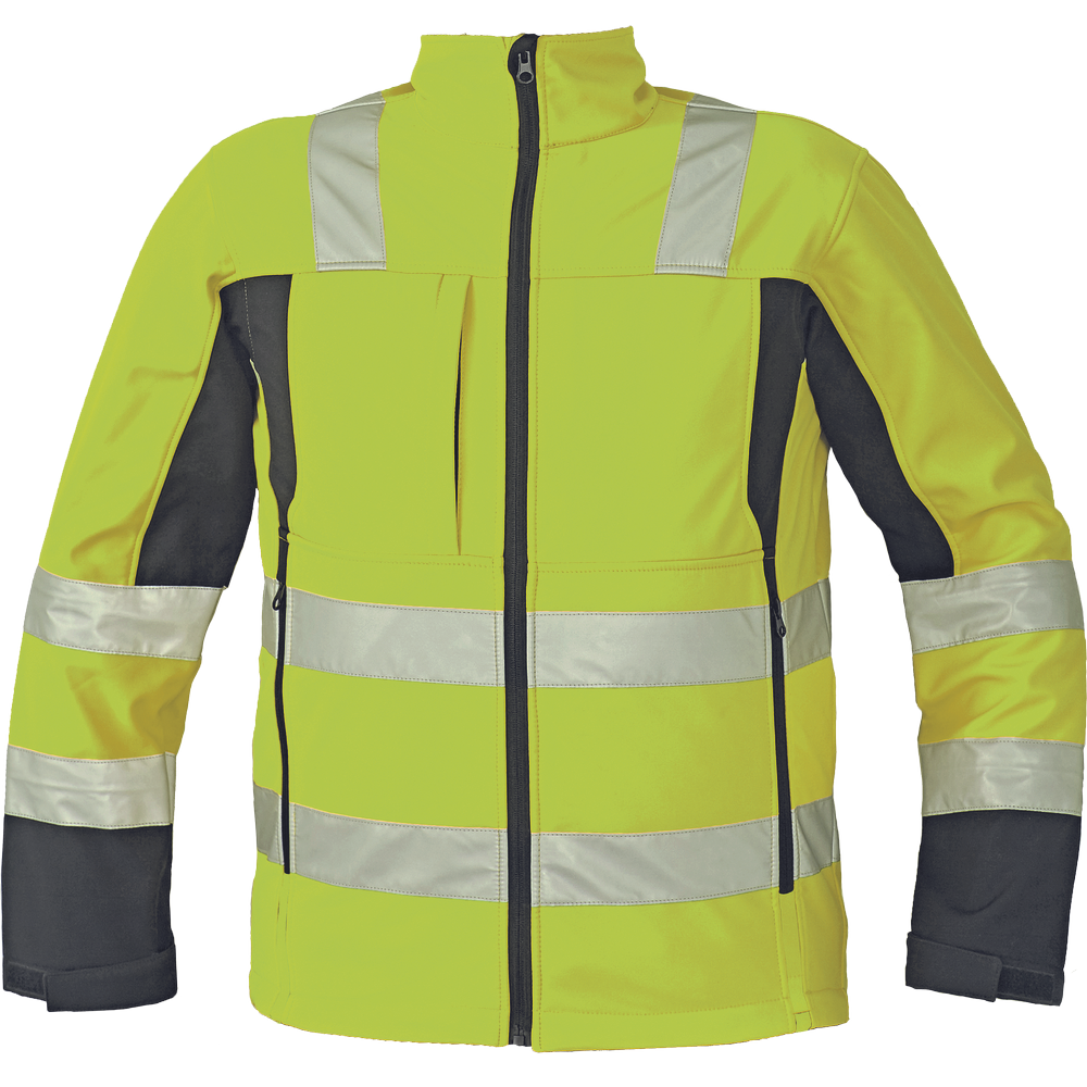 • pánská HI-VIS softshellová voděodolná bunda • reflexní pruhy přes ramena, okolo boků a rukávů • 2 postranní kapsy na zip, 1 náprsní kapsa na zip • stahování ve spodní části • velcro nastavení šíře rukávů