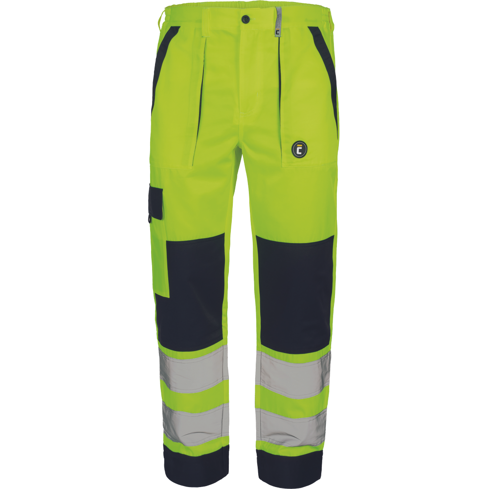 • pánské HI-VIS pracovní kalhoty s elastickým pasem • 2 přední kapsy • 1 stehenní kapsa • 2 zadní kapsy se zapínáním na suchý zip • 2 šité 7,5 cm široké reflexní pruhy na spodních částech nohavic • zesílená oblast kolen • nastavitelná délka nohavic