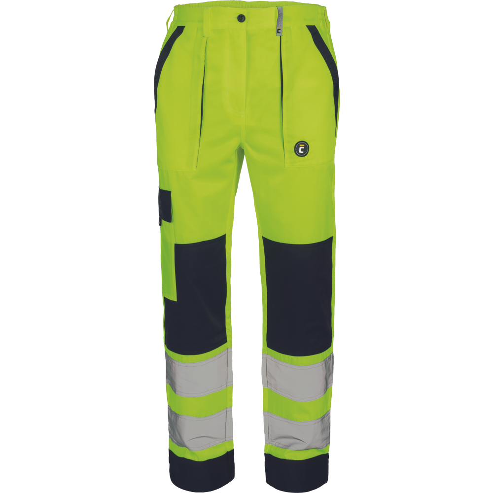 • dámské HI-VIS pracovní kalhoty s elastickým pasem • 2 přední kapsy • 1 stehenní kapsa • 2 zadní kapsy se zapínáním na suchý zip • 2 šité 7,5 cm široké reflexní pruhy na spodních částech nohavic • zesílená oblast kolen • nastavitelná délka nohavic