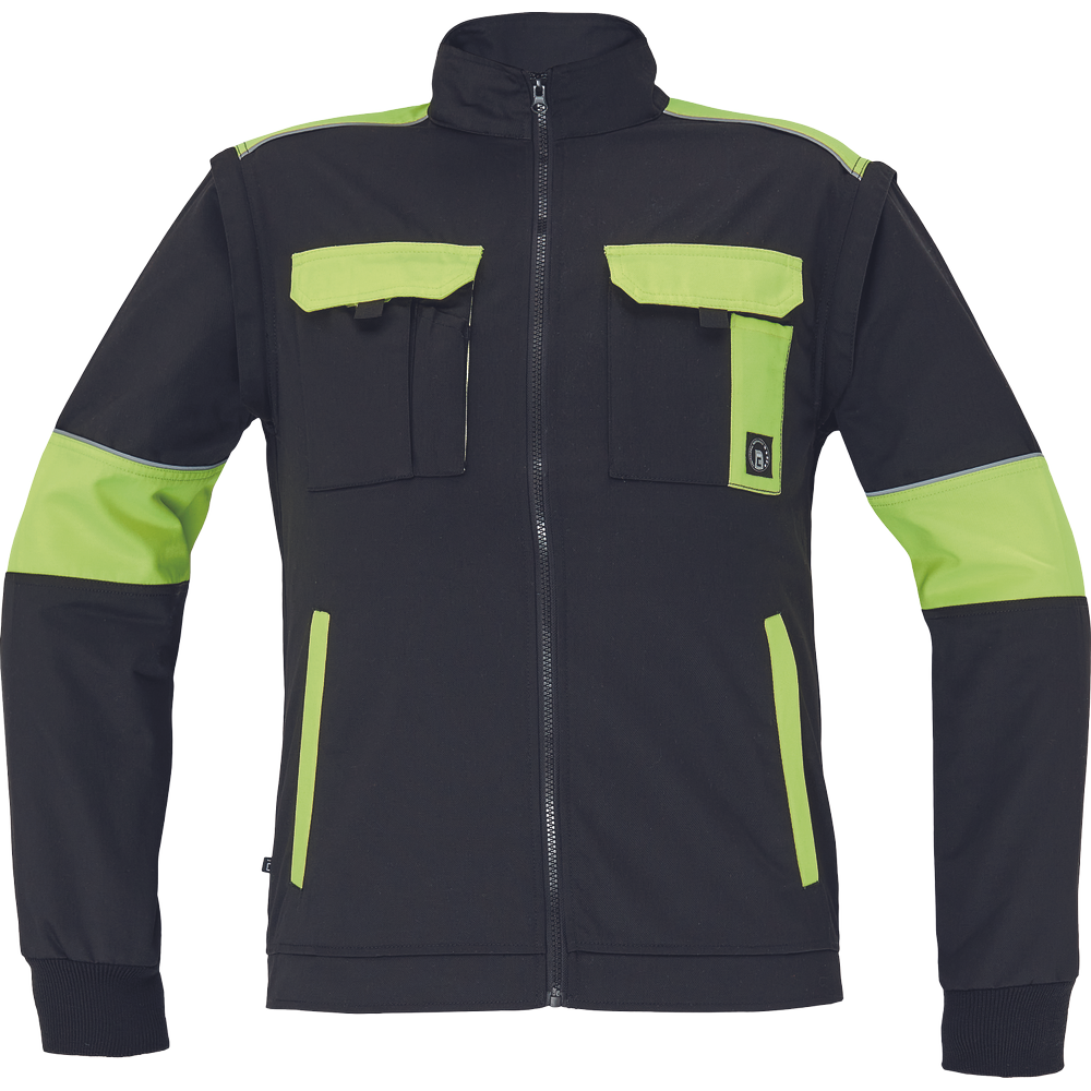 • pánská pracovní bunda se zapínáním na zip • odepínatelné rukávy • 2 přední kapsy, 2 náprsní kapsy • zesílení namáhaných míst loktů a ramen • reflexní paspulky • pružné náplety manžet rukávů a elastický spodní obvod pasu