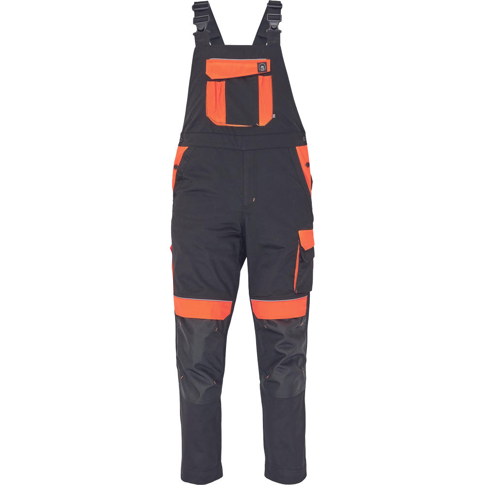 • pánské pracovní kalhoty s laclem a elastickým pasem • široké šle s plastovými sponami • 2 přední kapsy, 1 levá zdvojená stehenní kapsa • 1 velká náprsní kapsa na suchý zip, 2 zadní kapsy, 2 menší zadní kapsičky na pravém stehnu • reflexní paspulky • Oxford 600D zesílení kolen s možností horního vkládání nákoleníků • možnost prodloužení nohavic