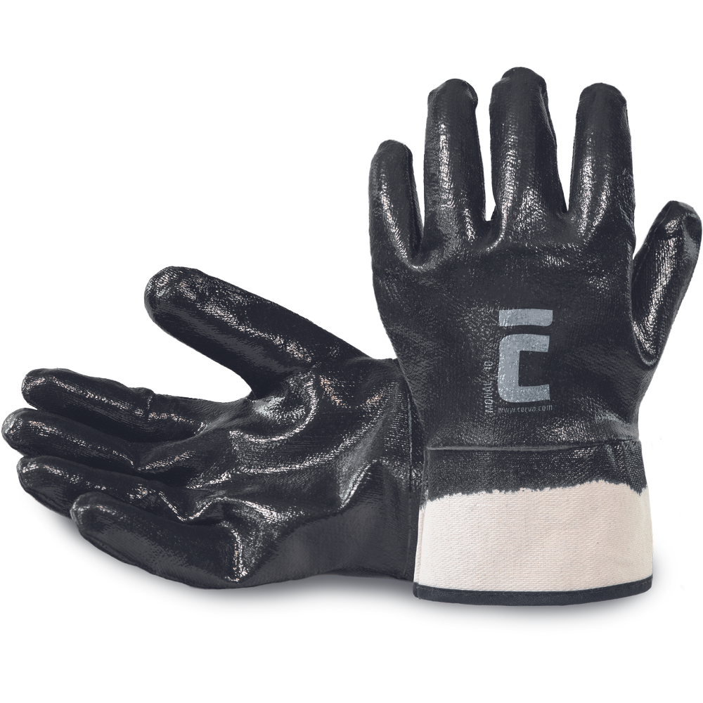 • rukavice šité z bavlněného úpletu • celomáčané v černém nitrilu • pevná manžeta