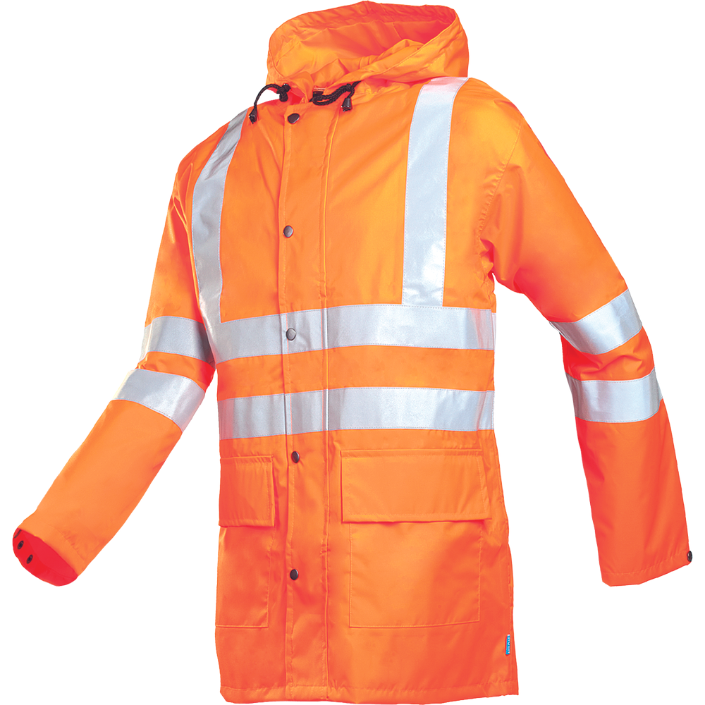 • HI-VIS nepromokavá a větruodolná bunda s kapucí a vysokou prodyšností • lehká a velmi pevná konstrukce oděvu zajišťuje vysoký komfort při práci • celopropínací přední zip překrytý légou • možnost stažení v pase • reflexní pruhy okolo hrudi, rukávů a přes ramena • 2 velké přední kapsy • odvětrání v podpaží • v 96 oranžové barvě je certifikována dle RIS 3279 TOM pro použití na železnicích