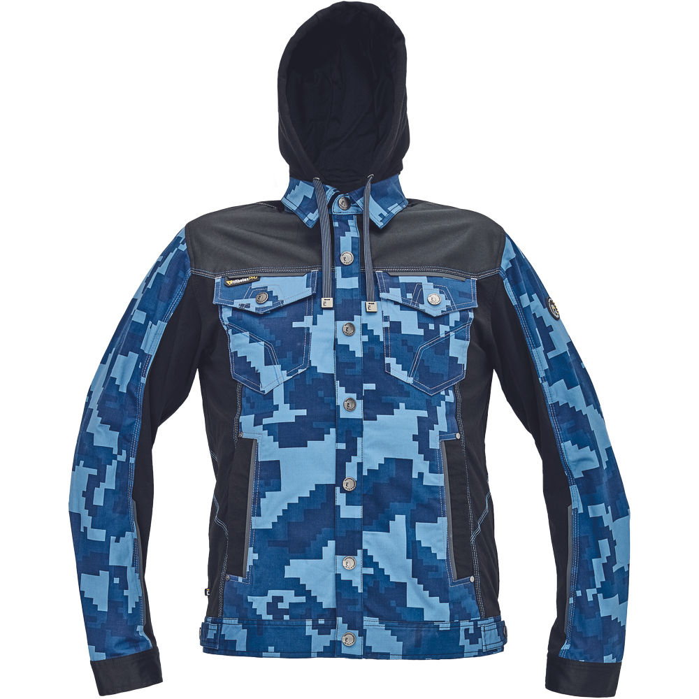 • pánská pracovní bunda v kamuflážovém potisku s odepínací kapucí a zapínáním na druky • elastický inovativní materiál TRIFIBETEX® v kombinaci se 4way strečovým materiálem TRIFIBETEXPRO® • trojité prošívání • CORDURA® zesílení v oblasti ramen • 2 boční kapsy • 2 náprsní kapsy na druky • nastavitelná šíře rukávů se zapínáním na druky • reflexní prvky v barevném odstínu