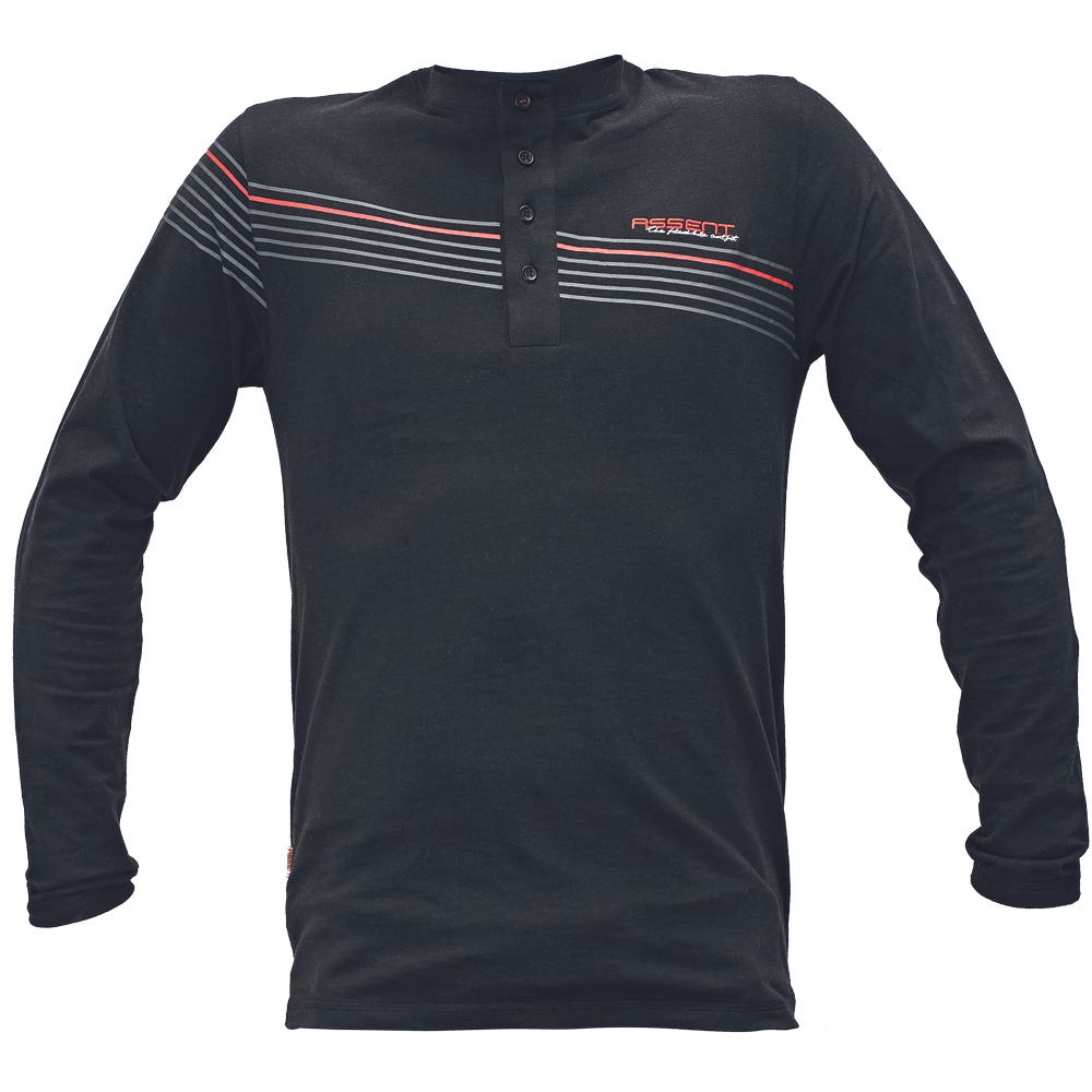 • pánské tričko s dlouhým rukávem • propínací léga na 4 knoflíky • průkrčník z elastického ribu • dekorativní potisk na předním díle a rukávech • výšivka Assent