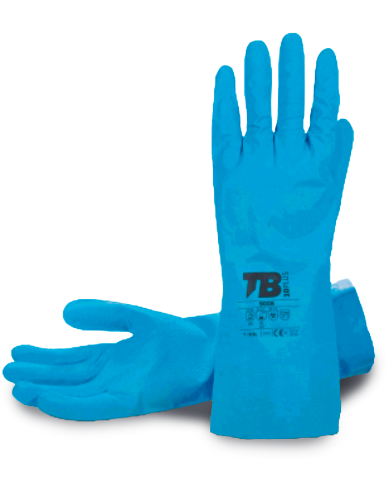 • modré nitrilové rukavice • uvnitř chlorovaná úprava • rovná manžeta • tloušťka: 0,20 mm • celková délka: 30 cm • nitril má dobrou odolnost proti olejům, mazivům, vedlejším ropným produktům, chemikáliím, kyselinám a neketonickým rozpouštědlům