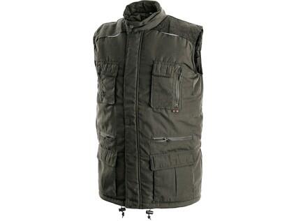 Pánská zateplená vesta, ramena a límec pošitý manšestrem, pružné stažení průramku, zapínání na zip krytý légou, stahování v dolním okraji, 8 vnějších kapes, reflexní doplňky, vnitřní kapsa na zip.