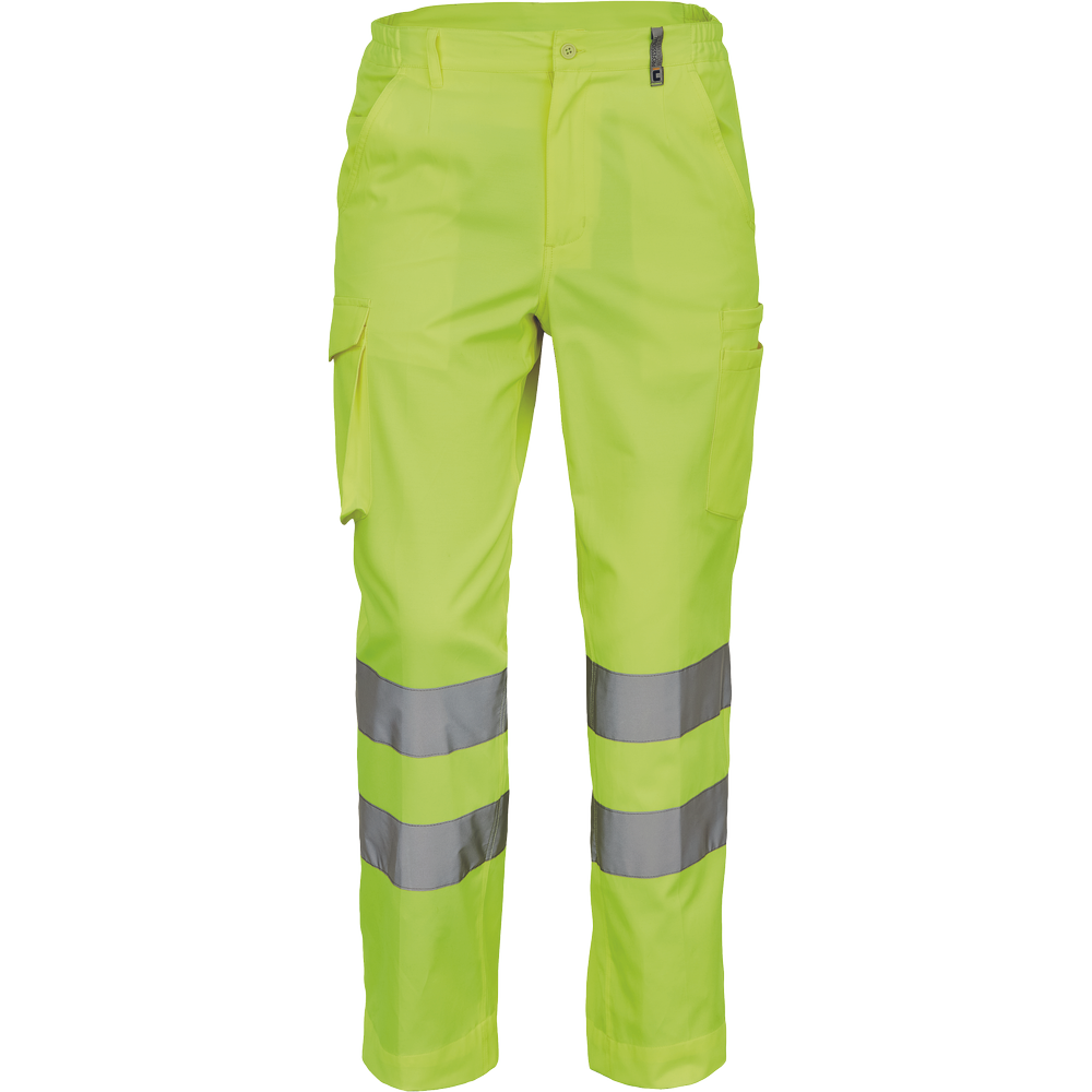 • pánské lehké full HI-VIS pracovní kalhoty a reflexními pruhy na nohavicích, elastický pas • 2 boční kapsy, 1 kapsička na mince • 2 multifunkční stehenní kapsy • 2 zadní kapsy • nastavitelná délka nohavic